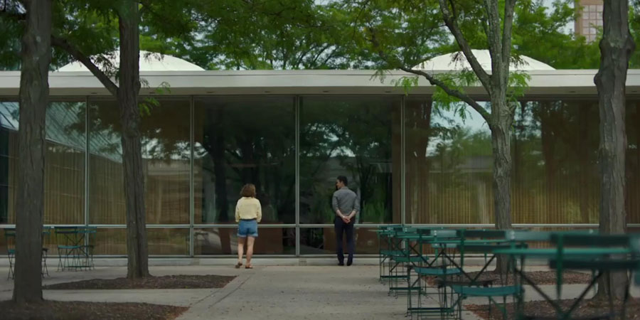 Casey’s loving perspective of her hometown fuels her conversations with Jin, but also shackles her to her denial, to what she can’t admit to herself; that there is more than her current life. While showing Jin one of her favourite buildings, the large, square windows frame the pair in their own individual space. Casey is a fountain of facts and knowledge straight out of a tour guide commentary, and she gets lost in her passion. Her face is rarely shown purely: instead, it is in the reflection of a window that we see her extolling the radicalism of an all-glass bank. A cut to a long shot looks back at her while she keeps talking, body turned away from Jin. When Jin implores her to talk about what moves her about the building, beyond its history – the view is from behind the glass. Her mouth is moving, hands gesturing, but the audio is silent. At the height of her enthusiasm, we’re set apart from Casey: the beautiful architecture acting as a barrier between the viewer and Casey’s ability to reveal her true feelings, even if it’s just about a building.