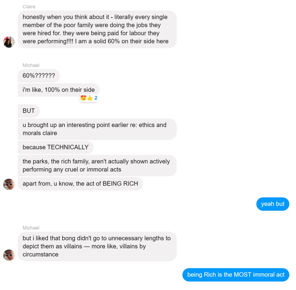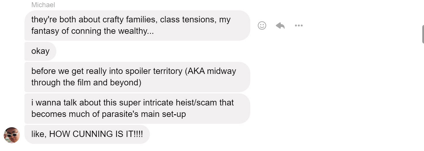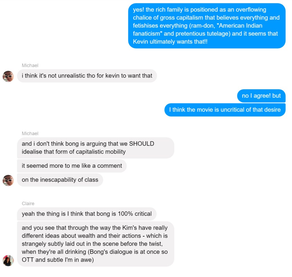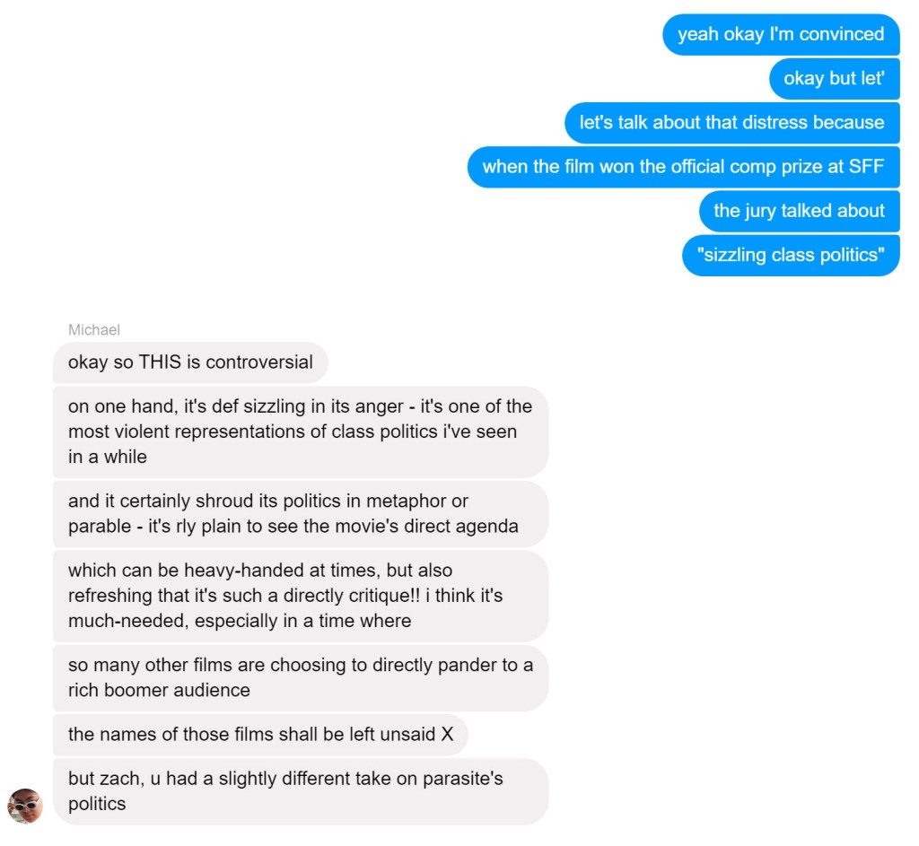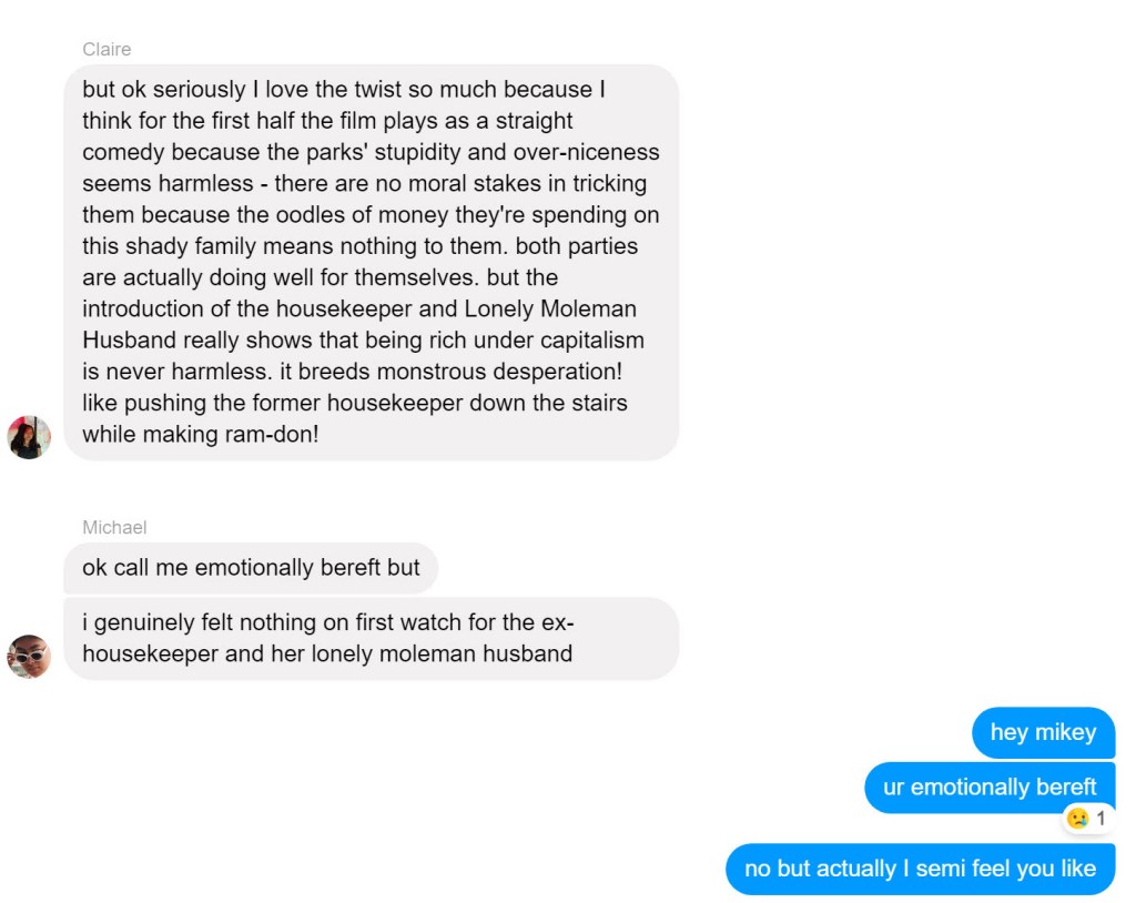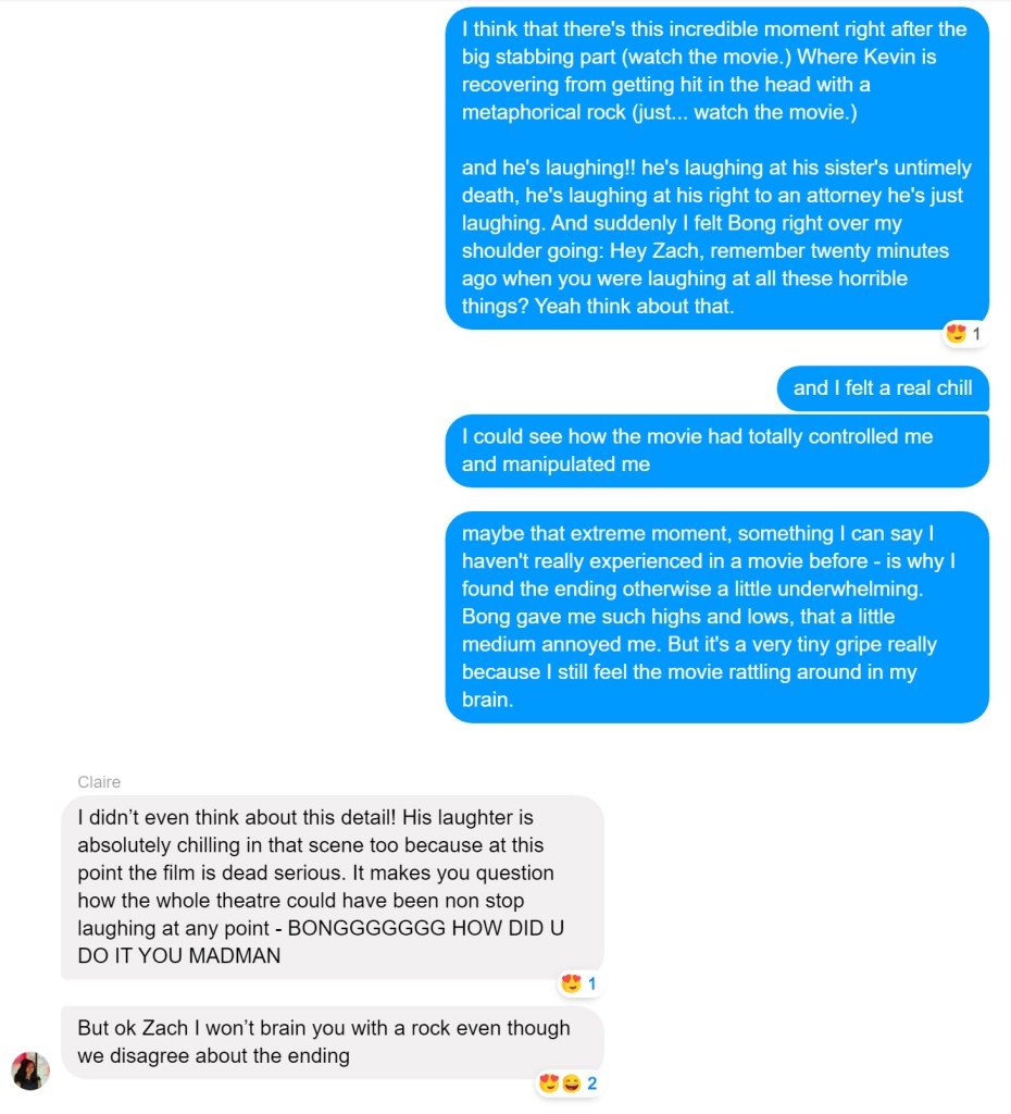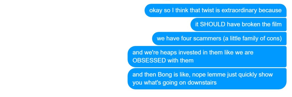A few weeks ago at the Sydney Film Festival, Rough Cut contributors, Michael Sun, Zach Karpinellison and Claire Cao, saw Bong’s Palme-dor winner Parasite. The film’s many twists and shocks have kept the three chatting ever since. Clearly the contents of the ‘Bong d’Or’ group chat foretold of the film’s success, with the Sydney Film Festival jury recently awarding Bong the $60,000 Sydney Film Prize.