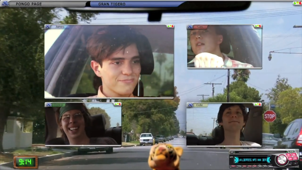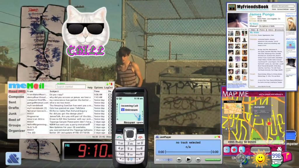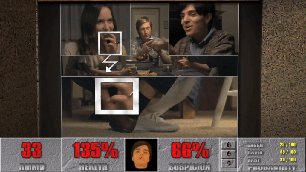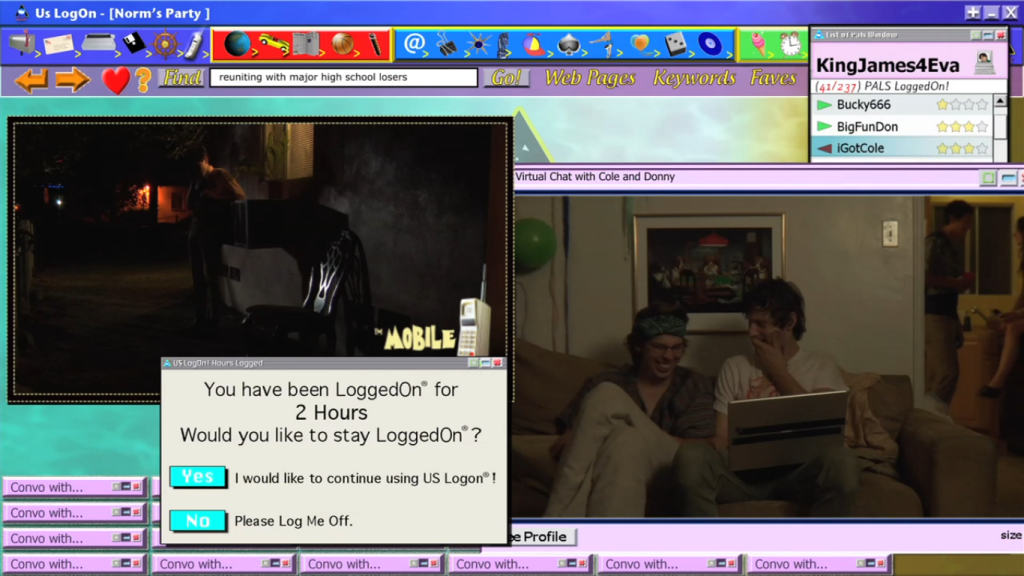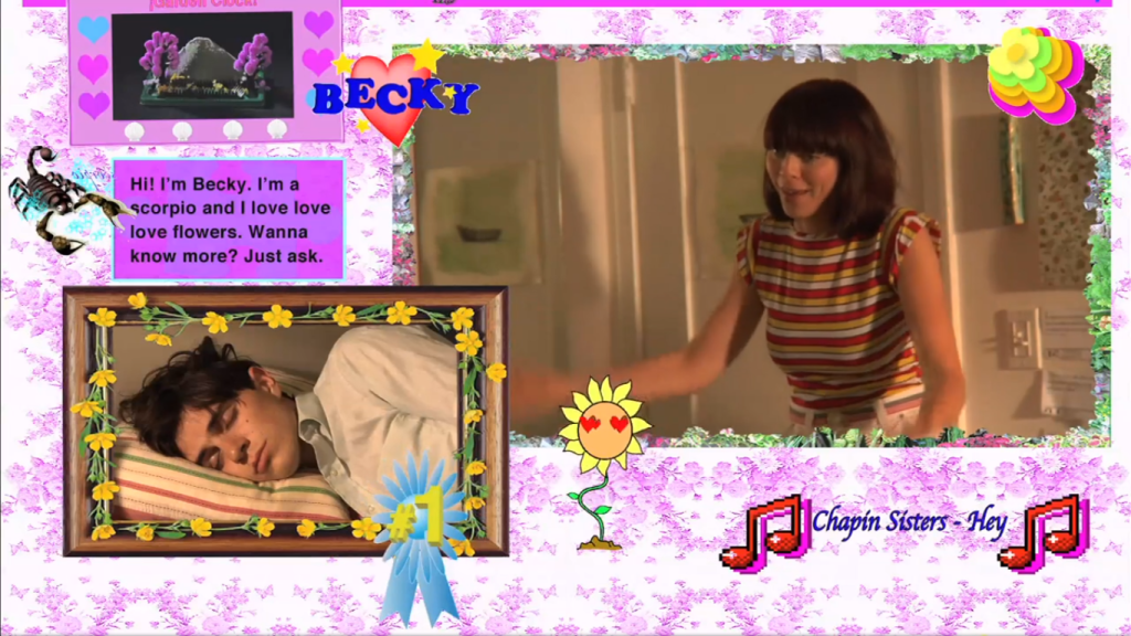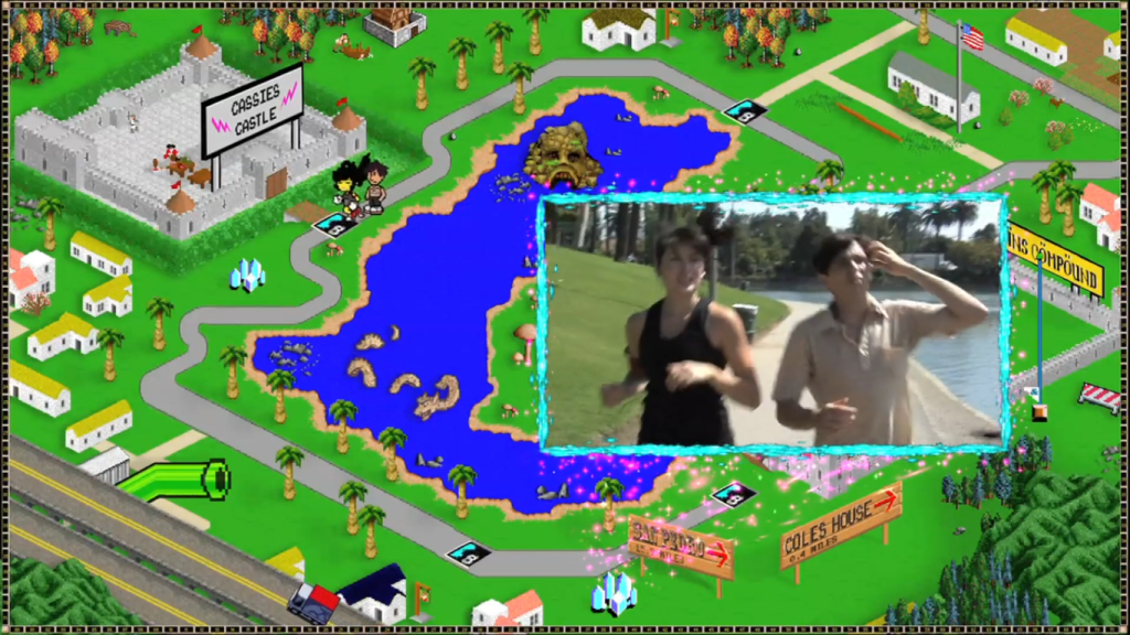 Sometimes, the film becomes a frantic venture through a blogroll: a drop-in with hopeless romantic Becky (Alexi Wasser) is composed as a snapshot of her sparkly pink blog, complete with gifs, an in-site music player, and video windows of her and James in conversation. A late stretch in the film turns the narrative into a 16bit video game world overview, not dissimilar to the level select screen in any given Super Mario Bros, where James’ avatar chases another suspect across the map. From there, the film momentarily morphs into Doom (1993), with James traversing pixelated dungeons, list in hand. Other times, it inexplicably becomes a sitcom, as a run-in with a suspect’s grandfather is backed by a studio laugh track and TV static lines.