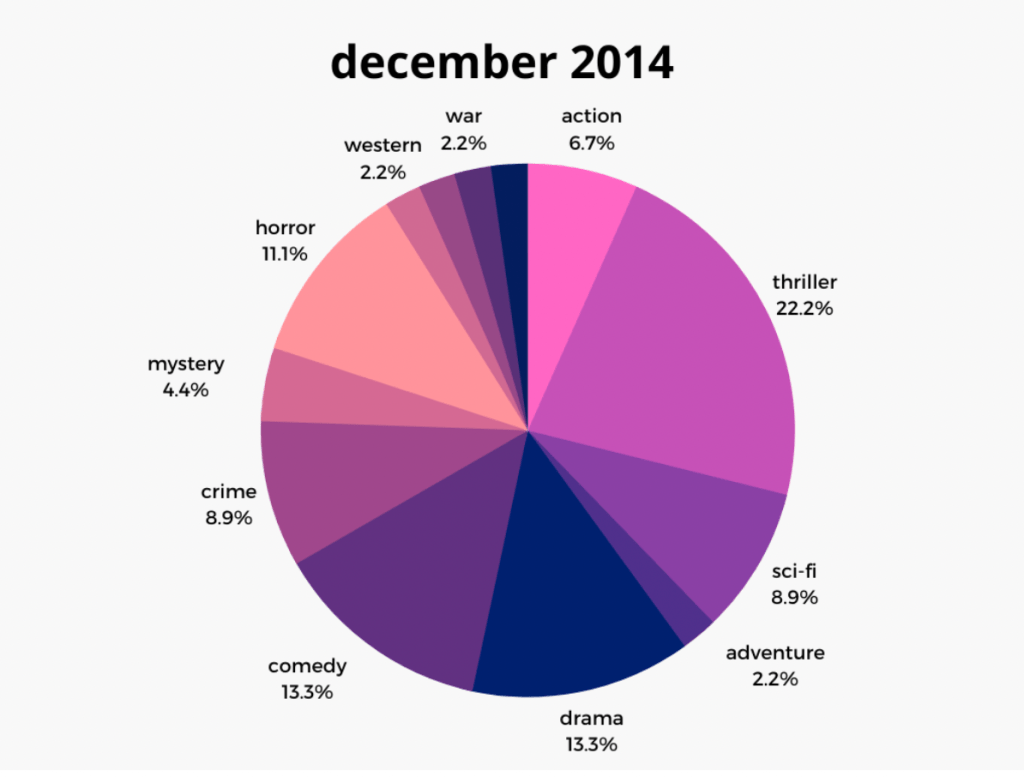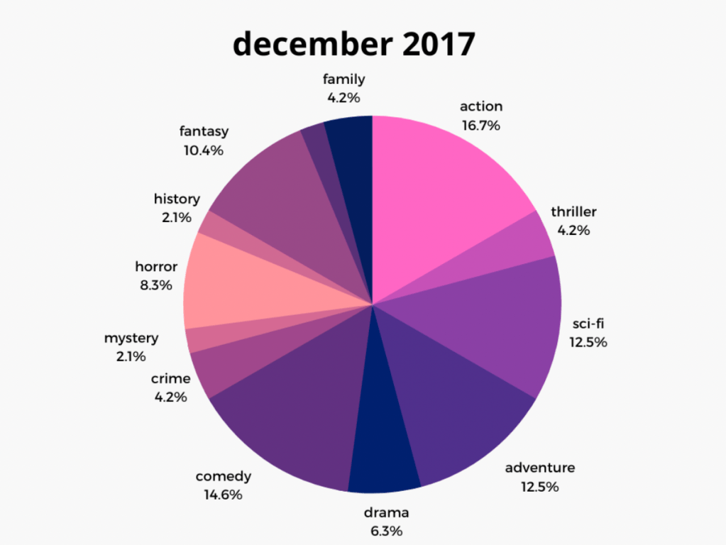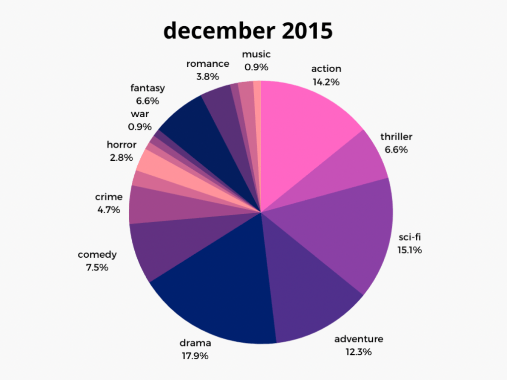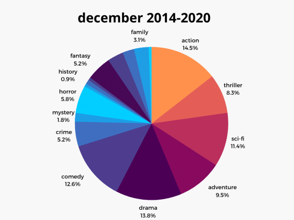 Overall, action (14.5%), drama (13.8%) and comedy (12.6%) – the big three – ultimately come out on top, no surprises there, but 2014 was a big year for thrillers (22.2%), and sci-fi pulls some bangers out every now and then (15.1% in 2015, 12.5% in 2017, and 16.7% in 2019). This is at least partially because of December’s place as the annual Star Wars viewing period from 2015 onwards, with Disney’s latest trilogy (The Force Awakens [2015], The Last Jedi [2017], and The Rise of Skywalker [2019]) blowing up the box office in the final weeks of the year.