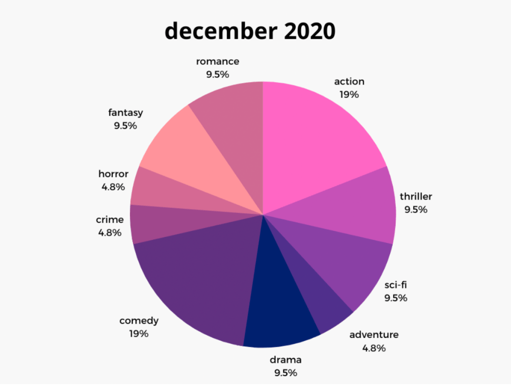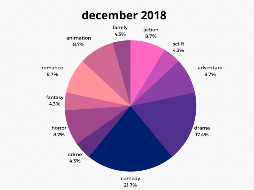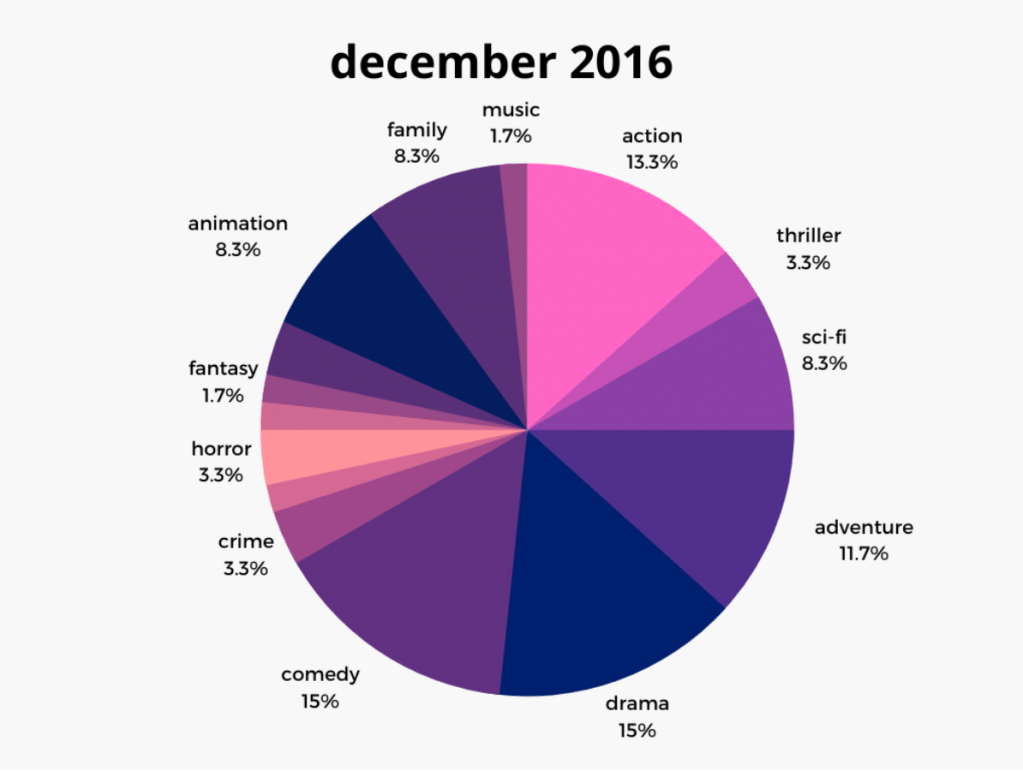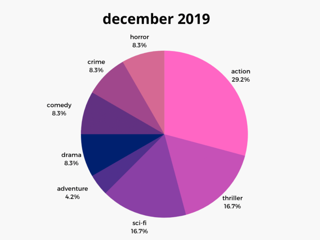 Overall, action (14.5%), drama (13.8%) and comedy (12.6%) – the big three – ultimately come out on top, no surprises there, but 2014 was a big year for thrillers (22.2%), and sci-fi pulls some bangers out every now and then (15.1% in 2015, 12.5% in 2017, and 16.7% in 2019). This is at least partially because of December’s place as the annual Star Wars viewing period from 2015 onwards, with Disney’s latest trilogy (The Force Awakens [2015], The Last Jedi [2017], and The Rise of Skywalker [2019]) blowing up the box office in the final weeks of the year.