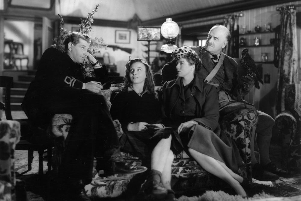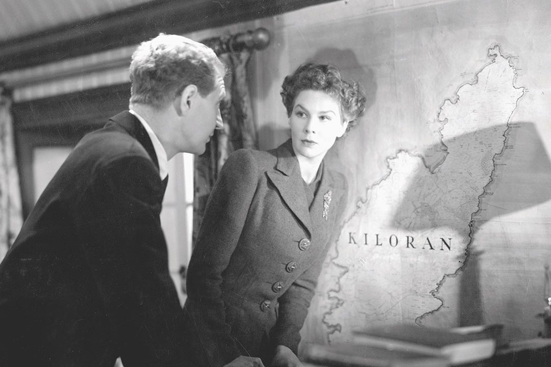 For Joan, the island’s enigmatic surroundings remain—at least for now—secondary to reaching her destination; she checks her hair and powders her face in a portable mirror, only half listening while her driver recounts the curse on the family whose castle looms through the fog and branches behind them. She makes her way down to the water’s edge, only to be told by a man in naval uniform and fellow passenger to Kiloran, Torquil (Roger Livesey), that there’ll be no crossing on account of the weather. This is the first delay induced by the island’s natural rhythms, which will soon become a longer postponement and, eventually, a complete change of direction. As Joan waits stubbornly for a boat that never comes, the wind snatches the paper itinerary from her hand and it is claimed by the sea.