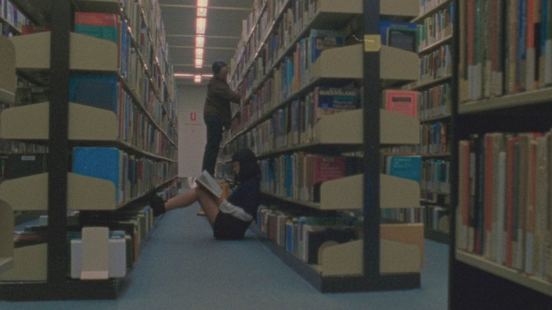 Even before beginning work on the film, Lam was compelled by the doubleness of the library, as a “grid-like structure” whose carefully delineated matrix nevertheless houses a wild, utopian charge. “This main library I always thought was really evocative—like really banal, but also quite specific to this time of universities, and what the libraries were.” The library, “still furnished in the seventies layout,” for Lam evokes the idealism of an all-too-brief period of free tertiary education in Australia, with its retro architecture becoming an ebullient playground for Lam and her actors alike. “It’s like the […] perfect place to do dolly movements, because it’s carpeted, you’ve got the [wheeling] chairs, there’s a million paths you can go down.” Graceful disorder reigns as Umi—a balletic, quietly impish presence—runs, crawls, and dances her way through the library, which, Lam says, laughing, “was open the whole time.”
