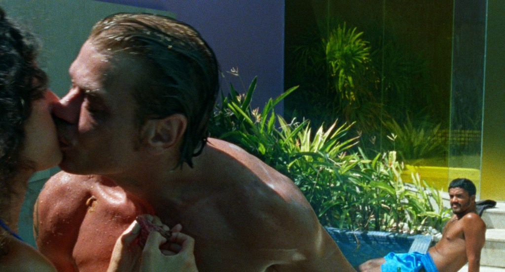 This totalising sense of lustiness is the biggest thing the film has going for it. It would have been possible to make a less explicit version of this film—one where the love triangle exists solely in gesture and suggestion, where much of the ‘action’ is implied by cutaways, and the little that we do see is shot tastefully, with everything below the hip kept out of frame. But that film would have been decidedly worse. Aïnouz is an accomplished stylist, and by holding back nothing, he allows his actors to really go for it too. It’s fun watching Heraldo and Dayana fuck nasty because Xavier and Rocha have plenty of chemistry, and they’re clearly enjoying flexing actorly muscles that they mightn’t get to use that often. Assunção is having a field day as Elias; he finds a couple dozen different ways to play horny menace—the only character beat he seems to have—and they’re all as maniacal as they are delightful.