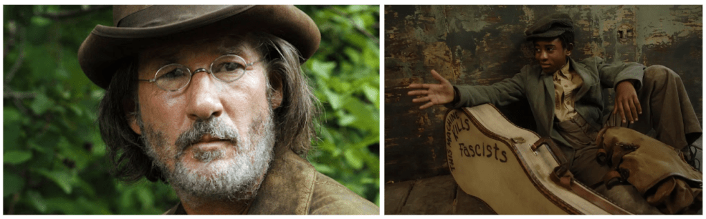 “Everyone knows I am not a folk singer,” Blanchett’s character says, staring at us through the camera in what plays as a comedic moment. It may be a reference to the criticism directed towards the Dylan Blanchett was based on at the time, but by breaking the fourth wall again, it is also an abrupt awareness that this performance, and therefore this movie, is not real. The film ends as it begins—with diegetic bangs cutting between the six Dylans, followed by a montage. After seeing the ending of Gere’s fugitive, which is similar to how Franklin’s Guthrie character begins, the film cuts to a sepia montage of young people lining up for a Dylan concert. It is only now that we are rewarded with the ‘real’ star playing the harmonica: the traditional folk music Blanchett’s Jude claimed not to play.