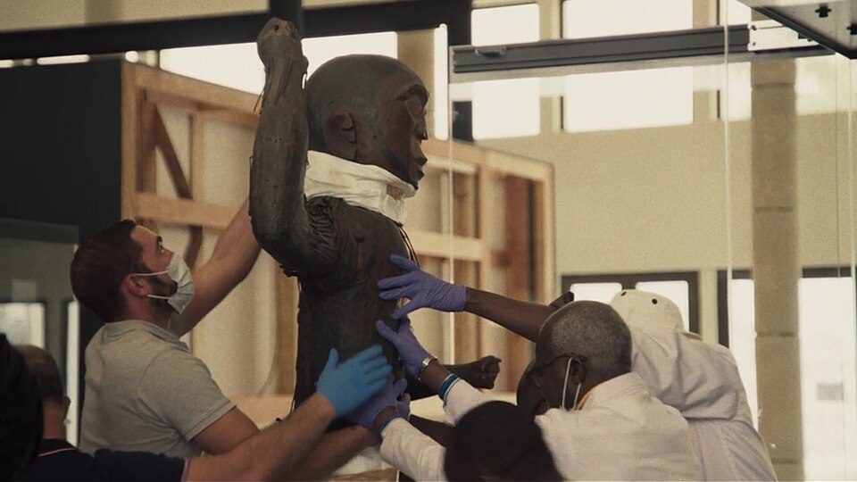 Following the still, sombre tone of the opening segment of the film, an electrifying debate between students at the University of Abomey-Calavi operates as something of a climax. Described by Diop as the “sole purpose of the film,” this second act demonstrates the enlivened response of the youth of Benin following the arrival of the sculptures. Shifting into the more restrained form of observational documentary, the student forum stresses the true complexity of repatriation, grounded not solely by academic theory, but by critical discourse marked by personal experience and visceral reaction. When one student speaks of her experience viewing the Benin sculptures for the first time, she recalls crying for 15 minutes and reflecting on the “ingenuity” of her ancestors.